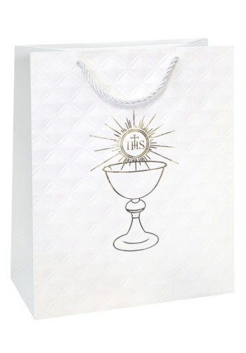 Táto elegantná darčeková taška je ideálnym doplnkom pre darček k Prvému svätému prijímaniu. Je vyrobená z kvalitného materiálu s kalichom v zlatej farbe, ktorý dodáva darčeku luxusný a slávnostný vzhľad. S praktickým a zároveň estetickým dizajnom je táto taška skvelým riešením na zabalenie darčeka pre túto výnimočnú príležitosť.