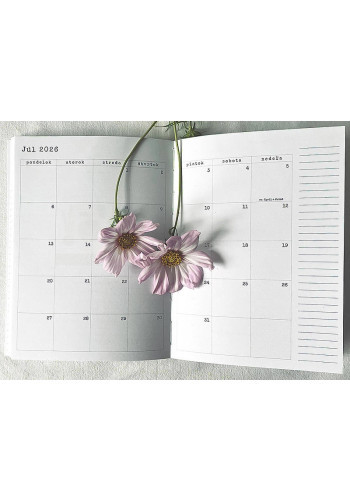 Tohtoročný diár nemá gumičku či pevné dosky - volila som jednoduchý a cenovo prijateľnejší variant na štýl klasického zápisníka, ktorý má mäkkú, ohýbateľnú obálku a vojde aj do kabelky. :)
