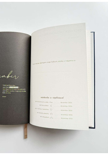 Vnútro: na začiatku každého mesiaca ťa čaká modlitba, ktorá ťa ním bude sprevádzať. Úplne milujem aj časť, kde si môžeš napísať za koho alebo za čo obetuješ ťažkosti, ktoré ťa v daný mesiac stretnú.