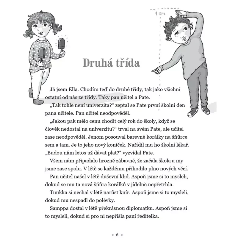 Další veselá dobrodružství Elly a jejích přátel v podobě tří krátkých příběhů. Ella a její přátelé jdou do druhé třídy a pan učitel je na pokraji zhroucení. Dokonce zkouší na sobě i žácích jistý druh meditace s korálky. Po čase do třídy přijde záhadný nový žák, který všechny šikanuje. Děti jsou přesvědčené, že je to mimozemšťan, který se proti nim spiknul s panem učitelem. V posledním příběhu je zoufalý pan učitel proti své vůli donucený uspořádat přespání ve škole, při němž se mu z rukou vymkne naprosto vše, co se vymknout může. Zasahují hasiči i policie, ale nakonec samozřejmě všechno dobře dopadne a Ella i její kamarádi si celé bláznivé dobrodružství náramně užijí. Určeno především čtenářům ve věku 6–10 let. Timo Parvela je původní profesí učitel, píše pro děti i pro dospělé a ve Finsku je v oblasti dětské literatury nepopiratelnou hvězdou. Jeho knihy byly přeloženy do více než třiceti jazyků a získal za ně řadu ocenění. Série o Elle patří k těm vůbec nejpopulárnějším. V Portále již vyšel první díl Ella ve škole.