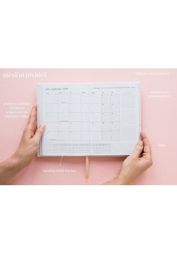 - každý mesiac: úvodná mesačná dvojstrana, plánovacia tabuľka, horizontálne týždenné rozloženie