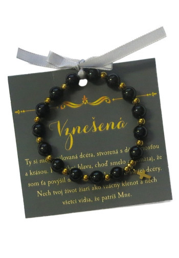 Veľkosť čiernych korálkov je 8 mm. Materiál ónyx. Kameň prírodný. Veľkosť zlatých lesklých korálkov je 4 mm. Materiál hematit. Prívesok krížik má veľkosť 8 mm. Materiál nerezová oceľ.