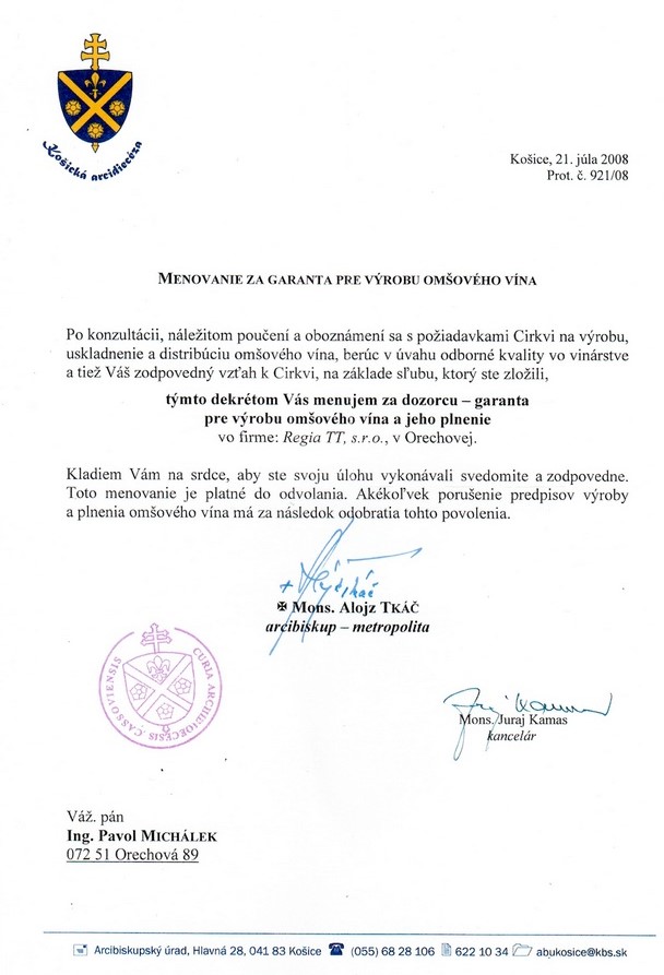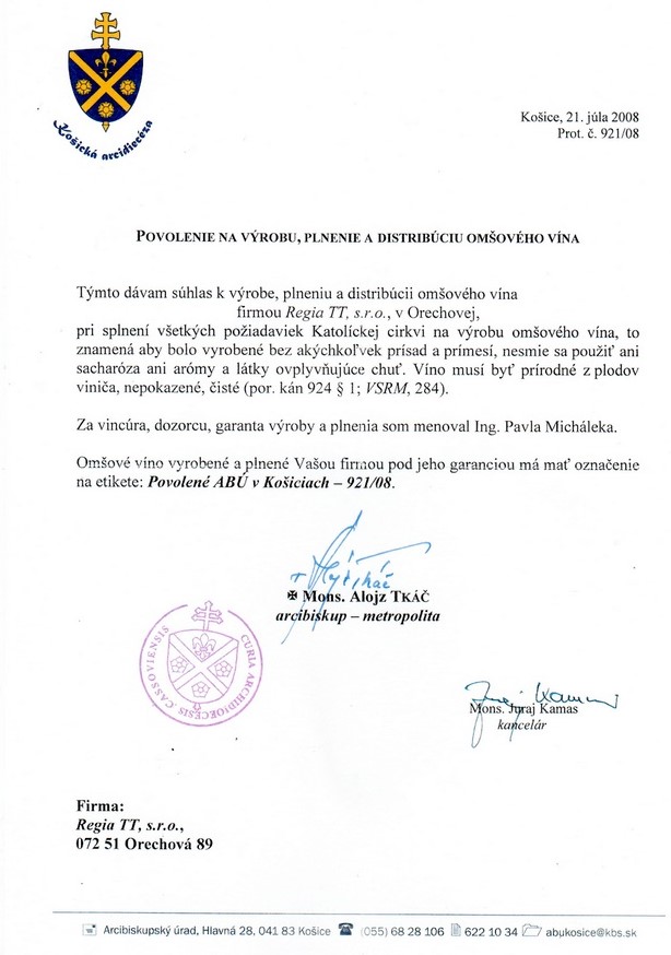 Harmonické, extraktívne víno s jemnou sviežou kyselinkou. Uplatnenie vína pre liturgické účely je povolené Arcibiskupským úradom v Košiciach. Víno SANCTA CECILIA je výrobené tzv. bezzásahovým spôsobom. Po vykvasení pôvodnými kvasinkami, nie sú v omšovom víne ďalej akýmkoľvek zásahom upravované jeho senzorické vlastnosti. Víno je autentické s pôvodnými dannosťami odrody i daného vinohradnického roka. Vinohradnícka obec Orechová, Sobranský vinohradnícky rajón, Vihorlatské pohorie .