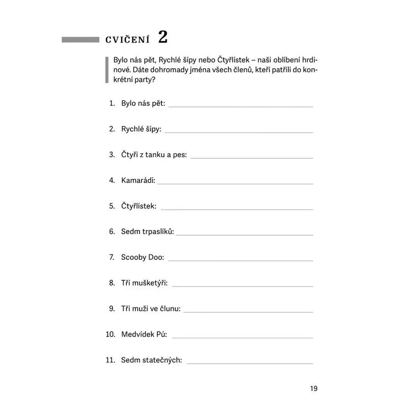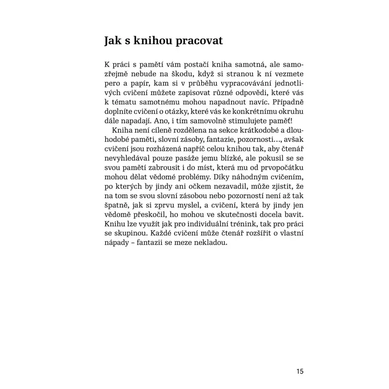 Kniha je rozdělena na kapitoly zaměřené na oblasti, jako je slovní zásoba, krátkodobá paměť, dlouhodobá paměť, logické myšlení, koncentrace pozornosti, matematické dovednosti či fantazie a kreativita, čímž se procvičují různé kognitivní funkce. Je určena primárně pro (aktivní) seniory, ale díky rozmanitosti cvičení po ní může sáhnout i dospělý, adolescent nebo i dítě.